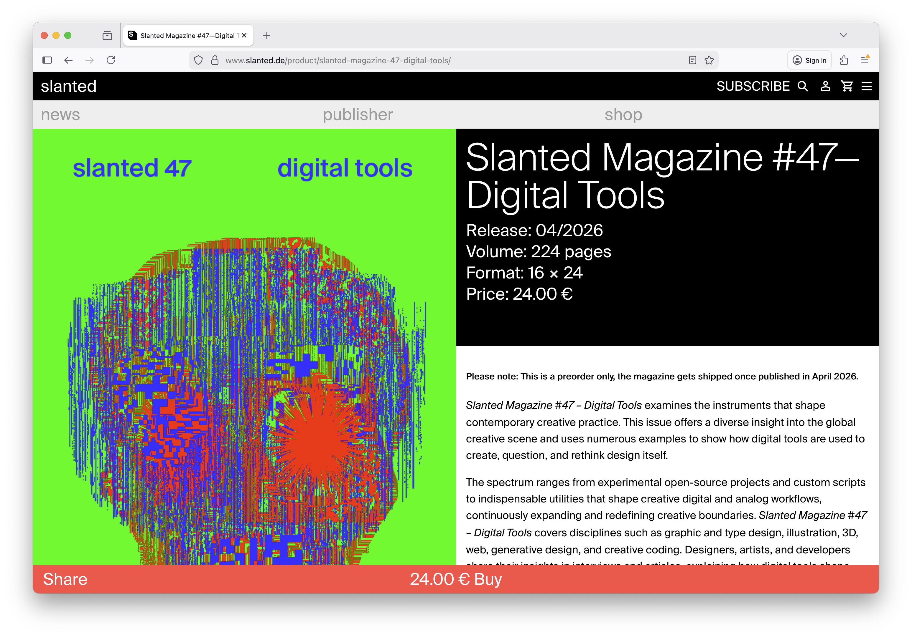 My interactive tool 'Rewriting Interface' will be featured in Slanted Magazine #47 on Digital Tools. The magazine examines the instruments that shape contemporary creative practice. This issue offers a diverse insight into the global creative scene and uses numerous examples to show how digital tools are used to create, question, and rethink design itself.